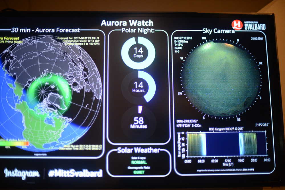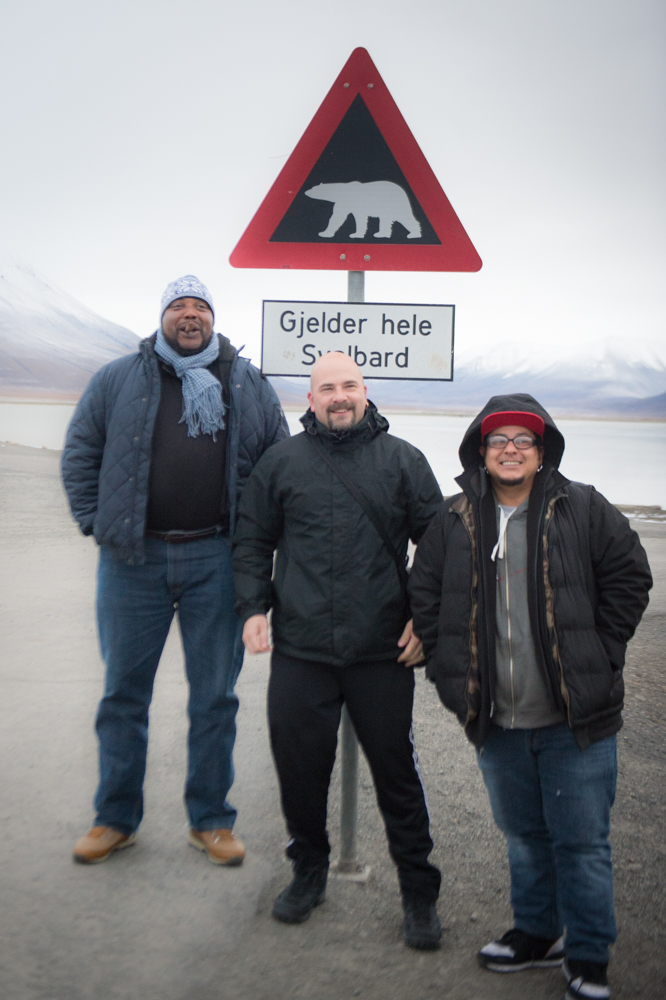 In the three-hour twilight of “day” in late October there is much to see and experience. The surrounding mountains around the town were formed by repeated ice ages, strangely flat-topped; glaciers coexist with fjords, valleys and mountains. Polar bear crossing signs on the outskirts of town remind you that a high impact weapon is needed to travel beyond the town limits. One can take dog sled rides across polar tundra and trips to a Russian settlement to get a Soviet stamp on a passport. Here, close to the top of the world, research stations, NASA and GPS satellite positionings dot the landscape, facing skyward. Svalbard is also home of the Global Seed Vault, where vegetation seeds from all over the world are held, protected by a gigantic bunker buried below the permafrost in a mountain.